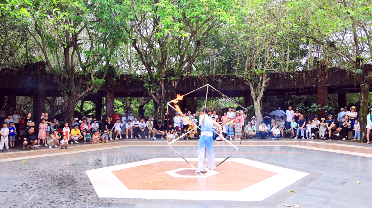 海口火山口公园内游人如织,火山民俗文化表演现场好评不断、掌声连连,将欢乐喜庆的节日氛围推向高潮。