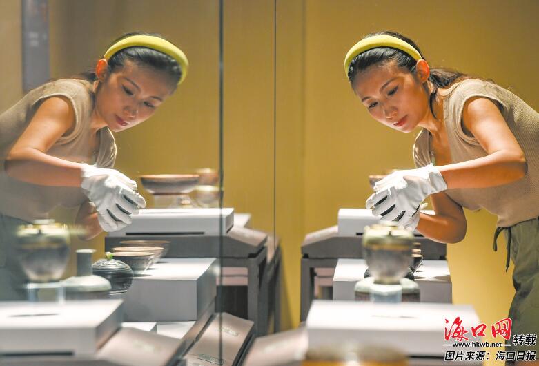 海口非物质文化遗产展示馆工作人员摆放椰雕展品。记者 康登淋 摄
