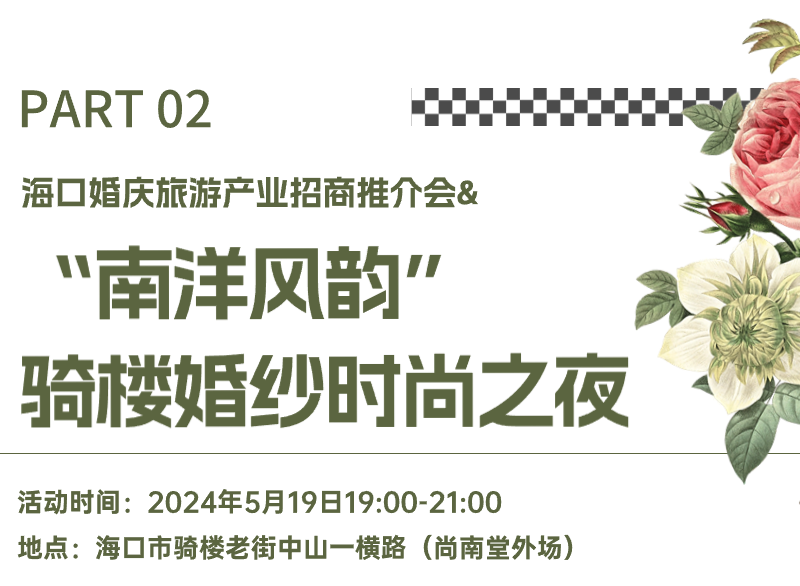 本次招商推介会将隆重推介海口婚庆策划、摄影、婚宴、蜜月旅行等优质婚旅资源和产品,并融入南洋风情婚纱走秀,打造一个婚庆旅游一站式服务点。无论是即将步入婚姻殿堂的备婚新人,还是想要定制蜜月之旅的新婚夫妻,都可以在这里享受到一站式便捷服务。