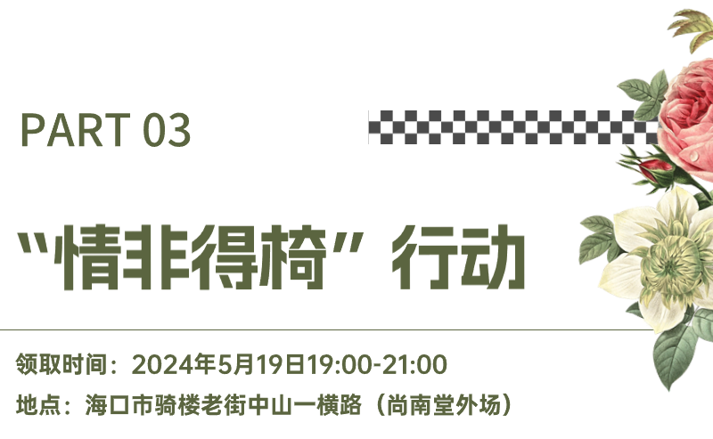 一张充满浪漫创意的花海沙发,带着惊喜和爱,空降海口街头,出发!一起去偶遇“情非得椅”,并花点时间,分享你的爱情,偶遇“情非得椅”并现场参与互动,就能get520精美礼品。