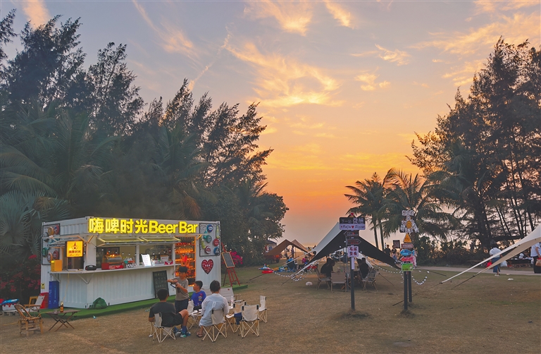 位于海口秀英区荣山寮村的金沙湾滨海公园里,市民游客带上露营装备来此享受惬意时光。 刘然 摄