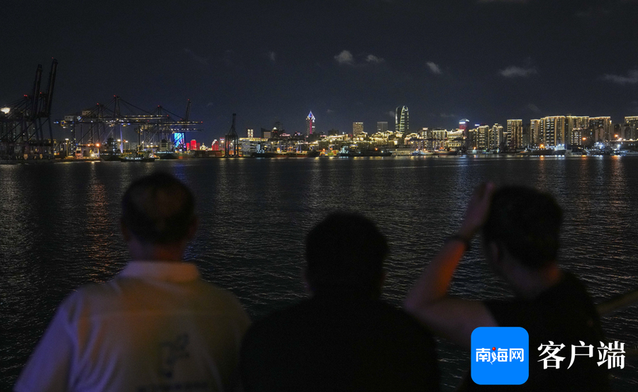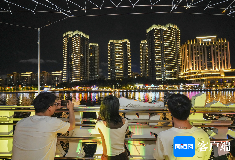 在“海南之星”号游船上,市民游客眺望海口湾夜景。记者 李昊 摄