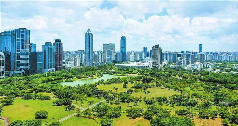 滨海大道一侧高楼大厦与万绿园绿植相映成趣。康登淋 摄