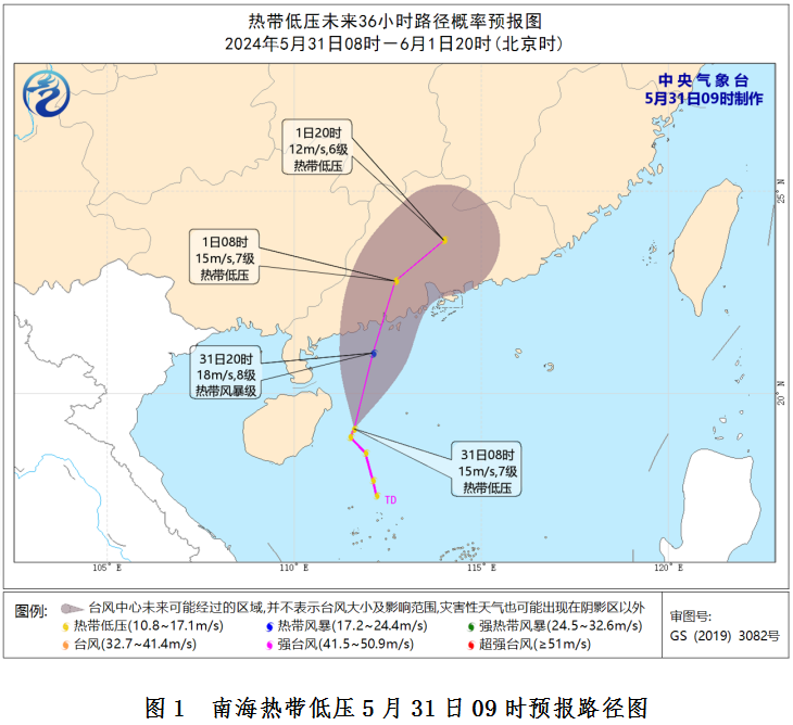 预计,该低压中心31日傍晚前后在广东珠江口西侧登陆,登陆时强度为热带低压或热带风暴级。