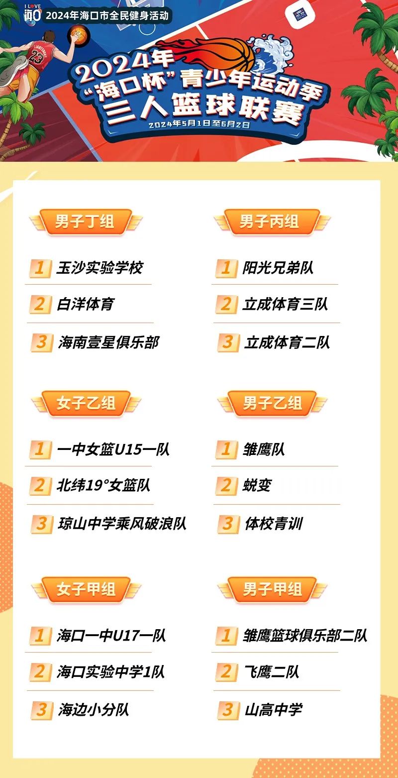 在为期两天的终极较量中,给海口广大市民和游客们带来一场场热血澎湃、酣畅淋漓的篮球体育盛宴。经过终极PK,2024年“海口杯”青少年三人篮球联赛总决赛前三强的战队分别是: