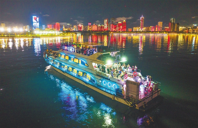 近日,航行在海口湾的“海南之星”号游船,带领游客领略璀璨的海口夜景。该游船从国家帆船基地公共码头出发,一路打卡秀英码头、万绿园、天空之山、世纪大桥、东坡老码头等海口标志性景观,极大丰富了市民游客夜览海口的体验。