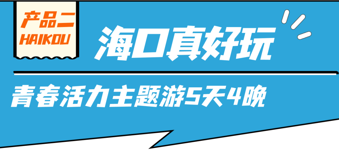 线路特色:青春狂欢,潮玩打卡不停歇!体验海上速度与激情、乘坐老爸茶巴士漫游、赏落日看演出、嗨购免税时尚品、夜游海口湾……解锁年轻人的宝藏玩法。