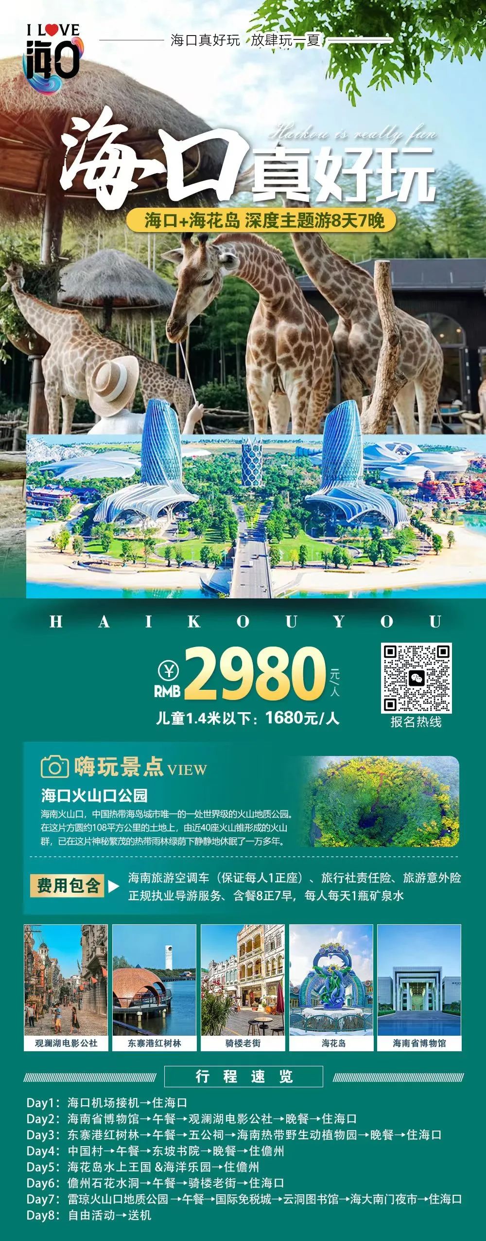 线路特色:两城联动深度游,体验感更强。精选海口、儋州景区景点及网红打卡地,带你收获美丽风景,体验一场难忘的“舌尖上的旅行”。