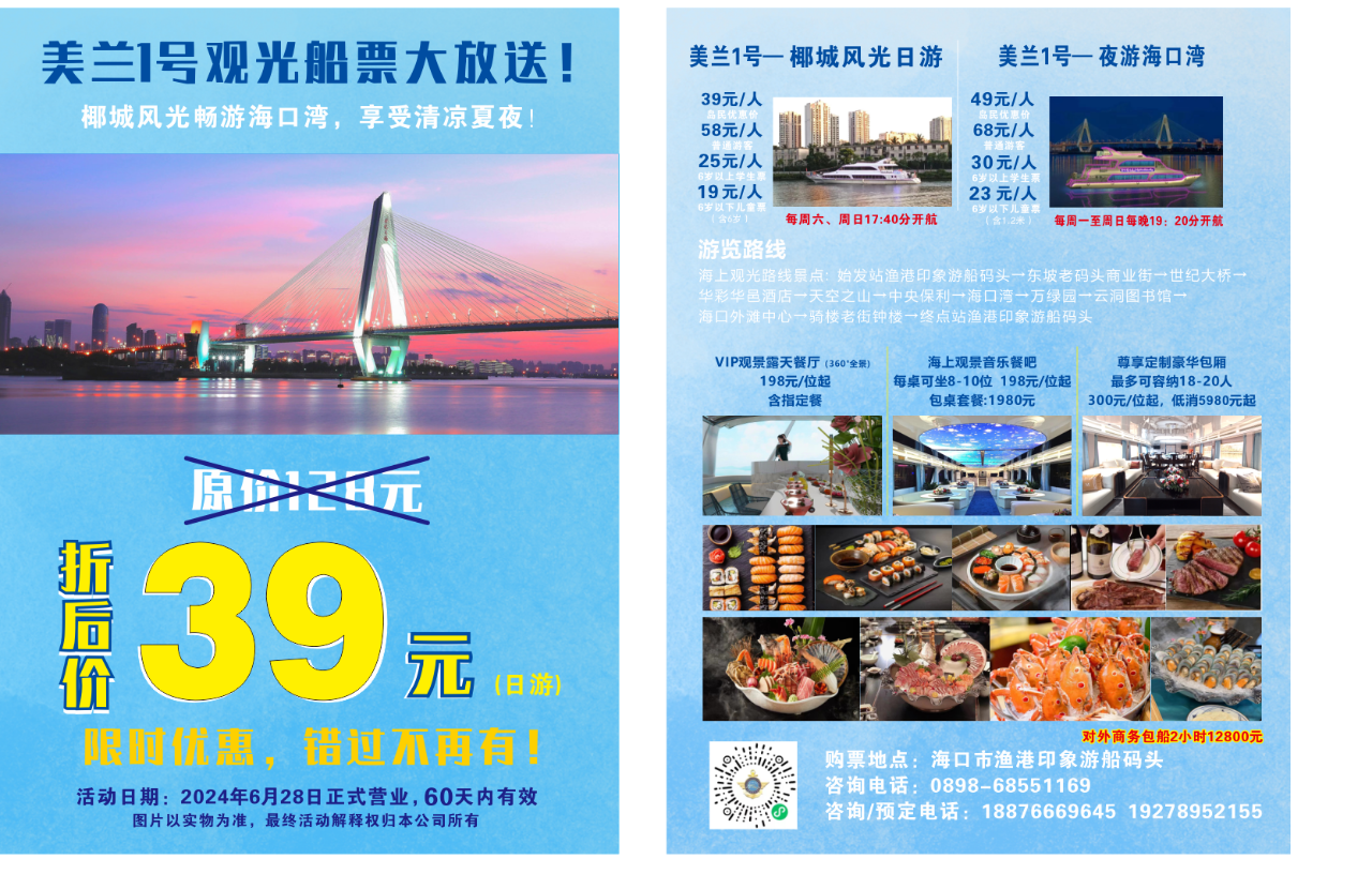 椰城风光畅游海口湾,享受清凉夏夜!为打造文旅消费新供给、新场景、新模式,配合海口美兰区丰富多彩、形式新颖的暑期文旅活动,丰富市民群众的文化生活,进一步擦亮“机遇海口 活力海口”的城市名片,“美兰1号”观光船2024年6月28日正式营业。