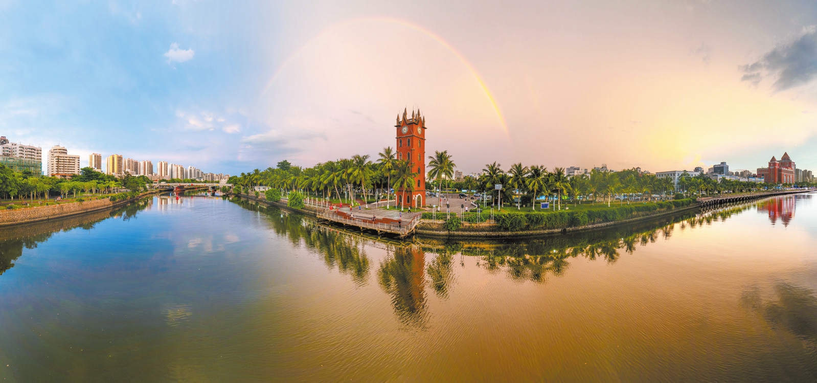 赤橙黄绿青蓝紫……这道美轮美奂的彩虹将海口的地标建筑——钟楼“揽入怀中”,光影倒映在海甸河河面上,为椰树成排的长堤路沿线增添了无尽韵味。 本报记者杨鹤摄
