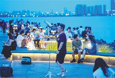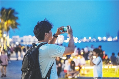 音乐爱好者在海口湾唱歌。本组图片均由海南日报全媒体记者 李天平 摄 7月2日,众多市民游客乘坐“美兰1号”观光游船,饱览海口湾的美丽夜色。船上的游客在欣赏海湾风光,岸边的众人则悠闲惬意地享受夏日海风。风景文娱两相宜,这是独属于海口湾的松弛感。