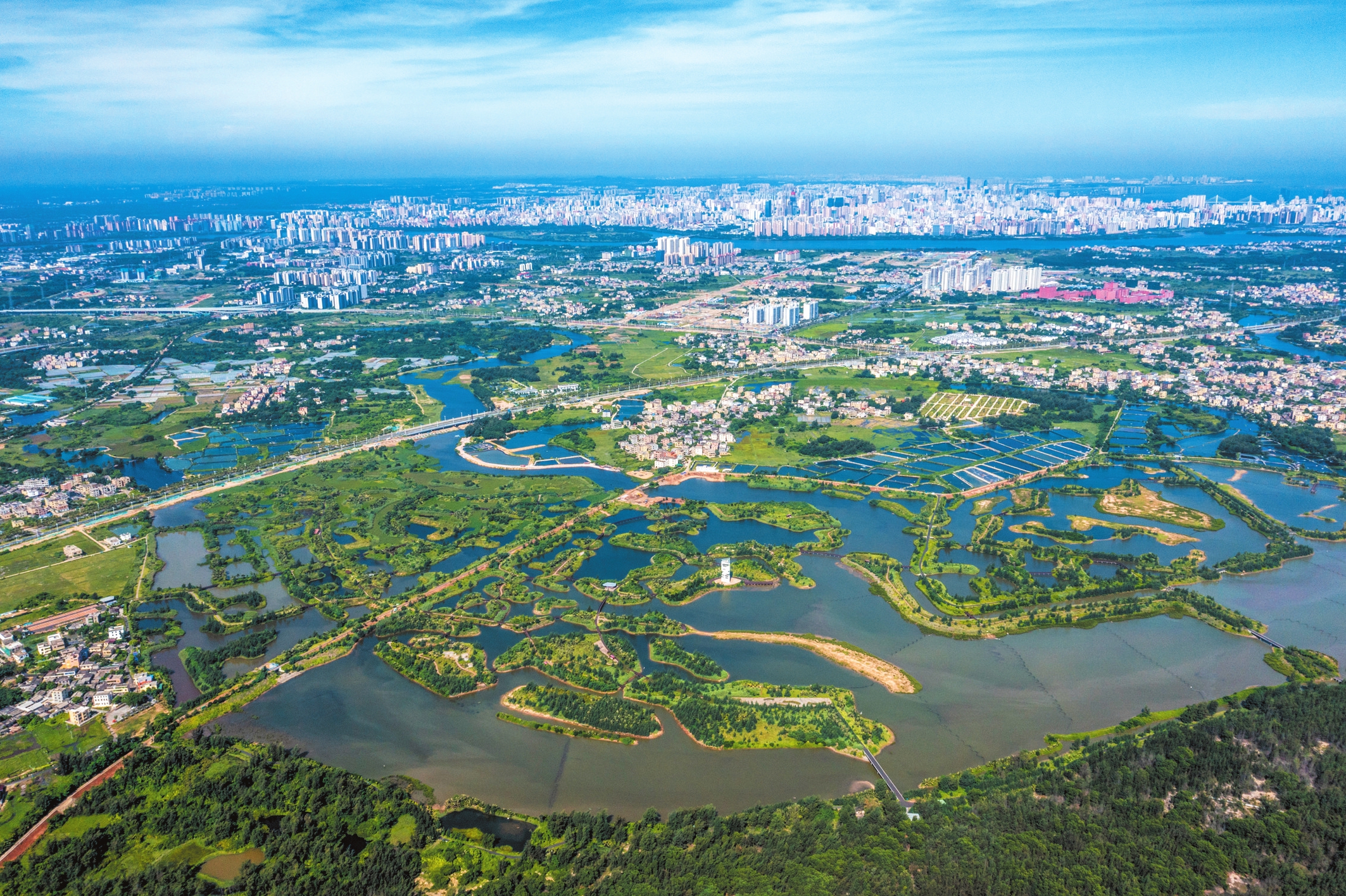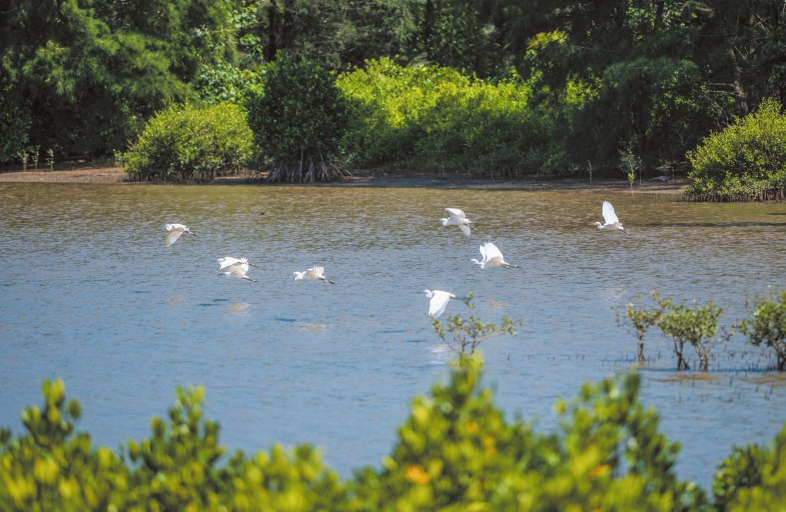 7月1日,海口市江东新区迈雅河湿地公园树岛星罗棋布,水流蜿蜒曲折,鹭鸟展翅齐飞。据了解,自2020年开工建设以来,迈雅河区域通过退渔还湿、河道疏浚、连通水系和种植植被等方式进行生态修复,将昔日的鱼塘改造成湿地公园。如今,迈雅河流域生态系统生物多样性显著提升,已成为许多鸟类的栖息地,同时也是市民游客休闲观光的好去处。