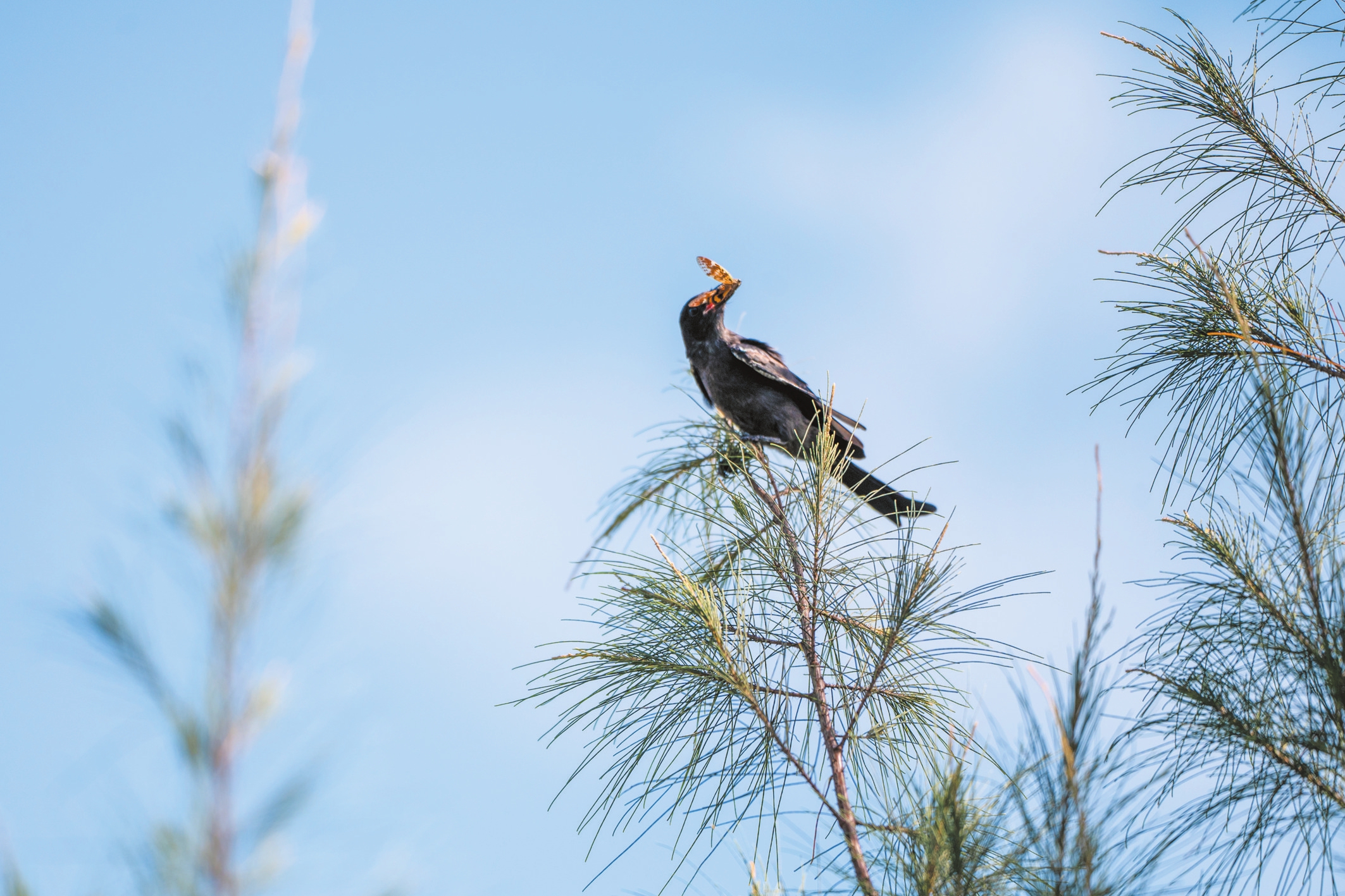 在迈雅河湿地公园里觅食的黑卷尾