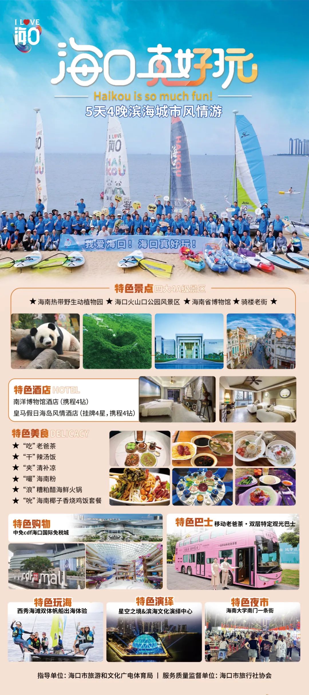 同时,在海口市旅游和文化广电体育局指导下,由海口市旅行社协会牵头,联合海口十家头部旅行社共同研发设计了【海口真好玩】5天4晚滨海城市文化风情游线路,并在全国范围内推广销售,达到全国收客的目的。