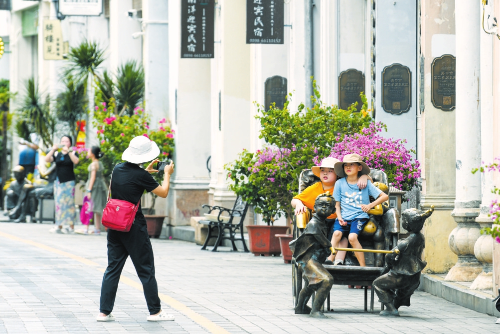 在骑楼老街,市民游客与雕塑作品《送别》合影,雕塑人物神态生动,展现出过去海南人为求生计“下南洋”时亲人送别的场景。