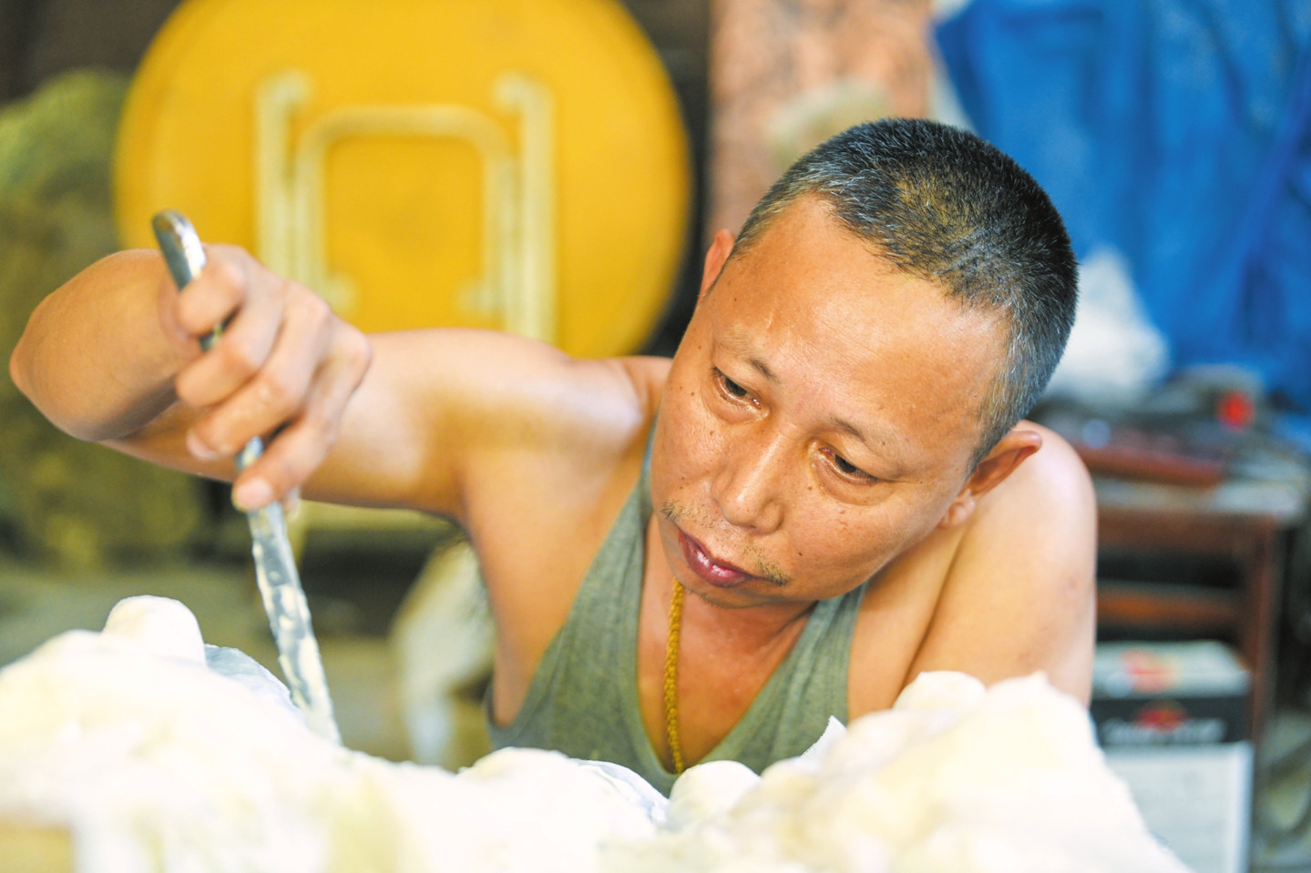 7月12日,在凌博雕塑工作室内,工作人员正在专心致志地进行雕塑翻模。