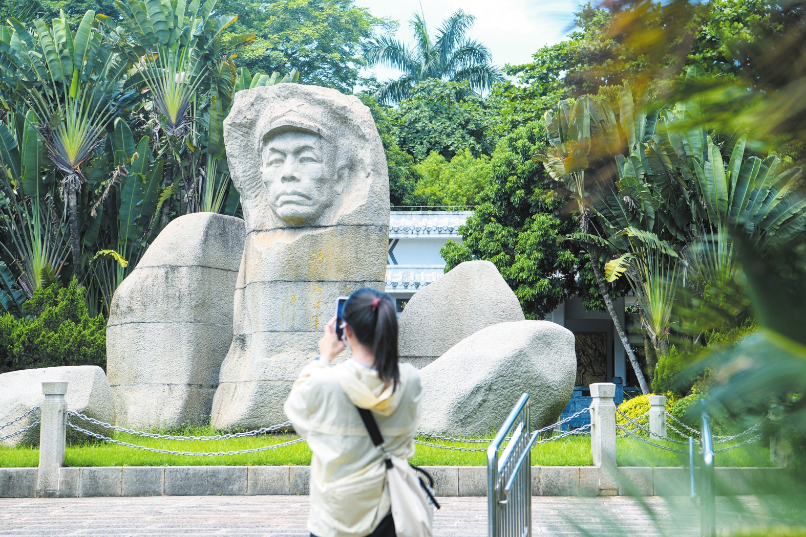 7月12日,在海口人民公园内,市民游客在冯白驹将军雕像前拍照留念。