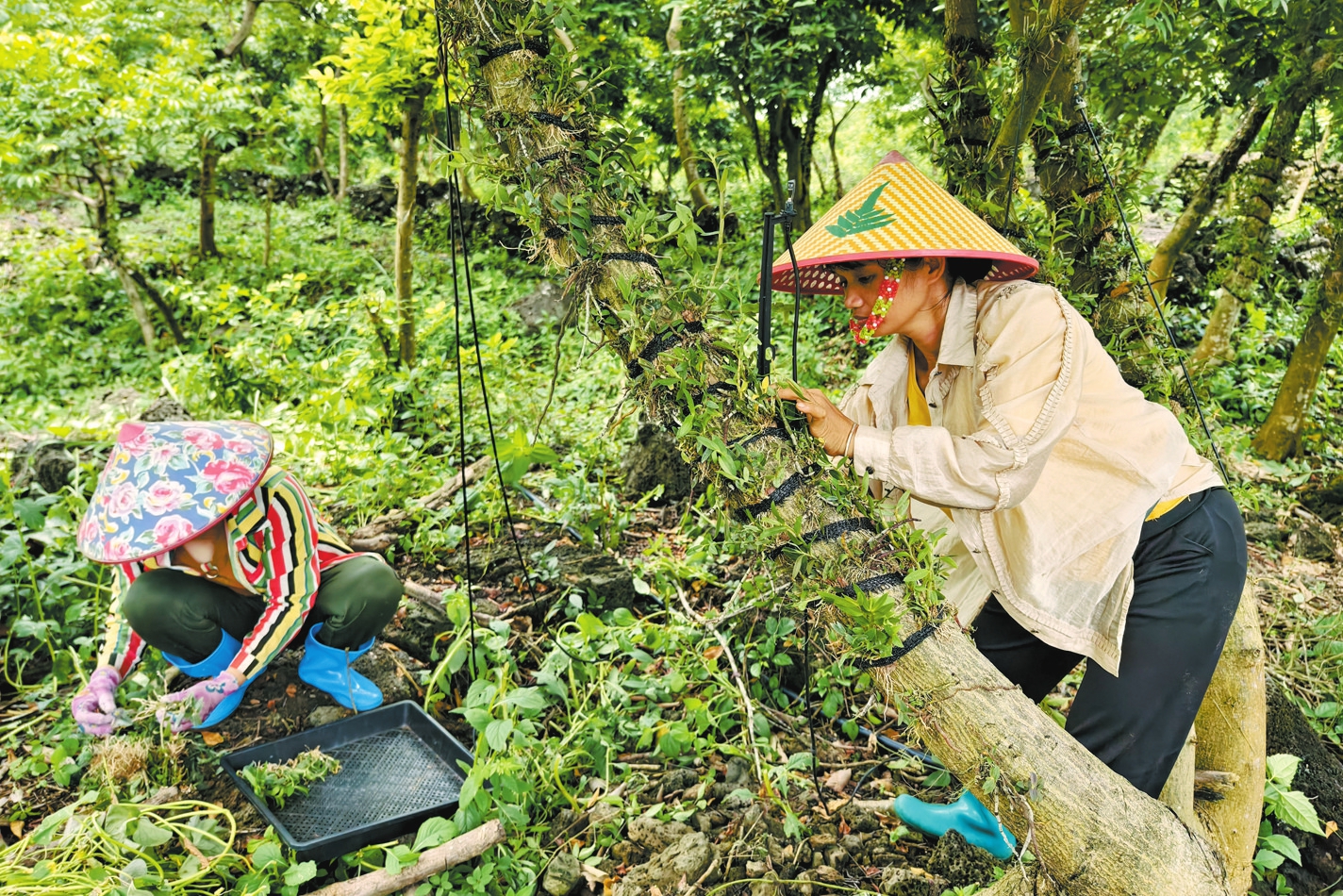 在海口施茶千亩生态有机火山石斛园内,村民在种植石斛苗。本报记者 石中华 摄