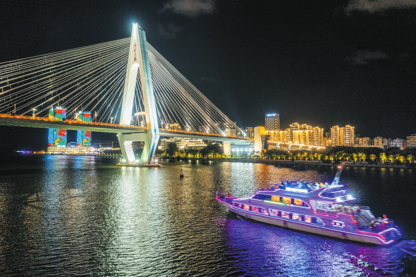 近日,市民游客乘坐“美兰1号”观光游船欣赏海口迷人夜景。 本报记者 石中华 摄