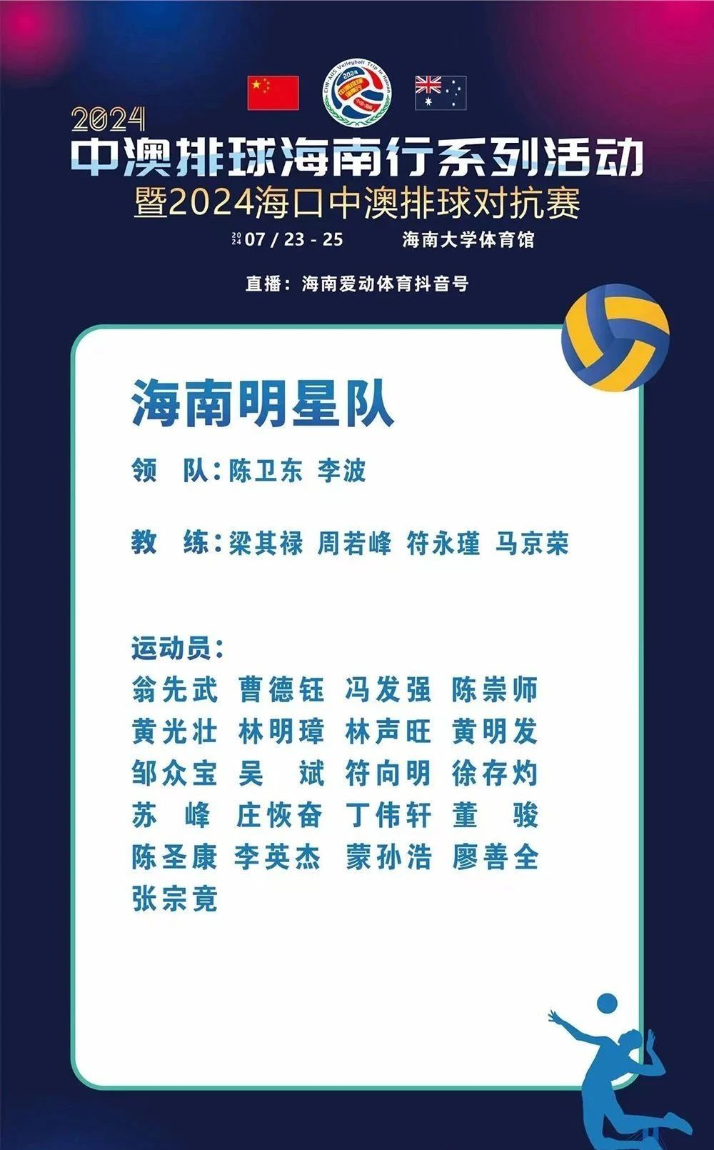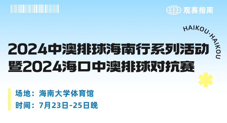 2024中澳排球海南行系列活动暨2024海口中澳排球对抗赛(以下简称“海口站”)将于7月23日-25日晚在海南大学体育馆进行。中国男排核心主力球员张景胤将率浙江博泰男排前来踢馆,海南明星队有冯发强等本土球星强势加盟,实力雄厚的澳大利亚男排国家队、天津食品集团男排将派悍将出战。巅峰对决即将一触即发,门票已正式开售,各位球迷欲购从速,热血排球等你现场见证。