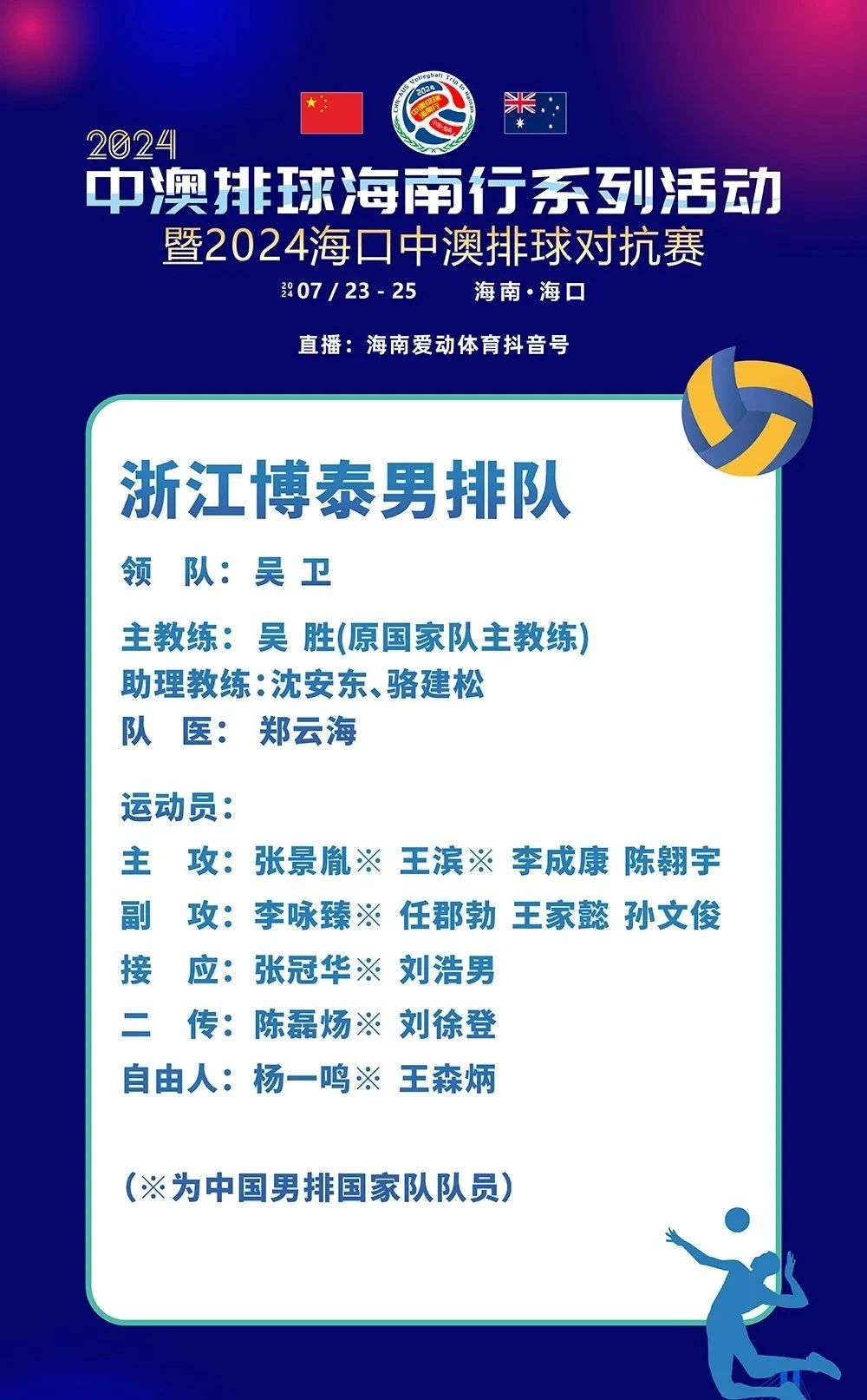 浙江博泰男排于今年6月底夺得2024年全国男排冠军赛的冠军,此次海口站的比赛,他们将以参加2024年全国男排冠军赛的阵容为班底,他们将在赛场上展现王者之师的实力与传统强队的底蕴。他们与澳大利亚男排国家队在六人制排球比赛中的强强对话更是充满看点。
