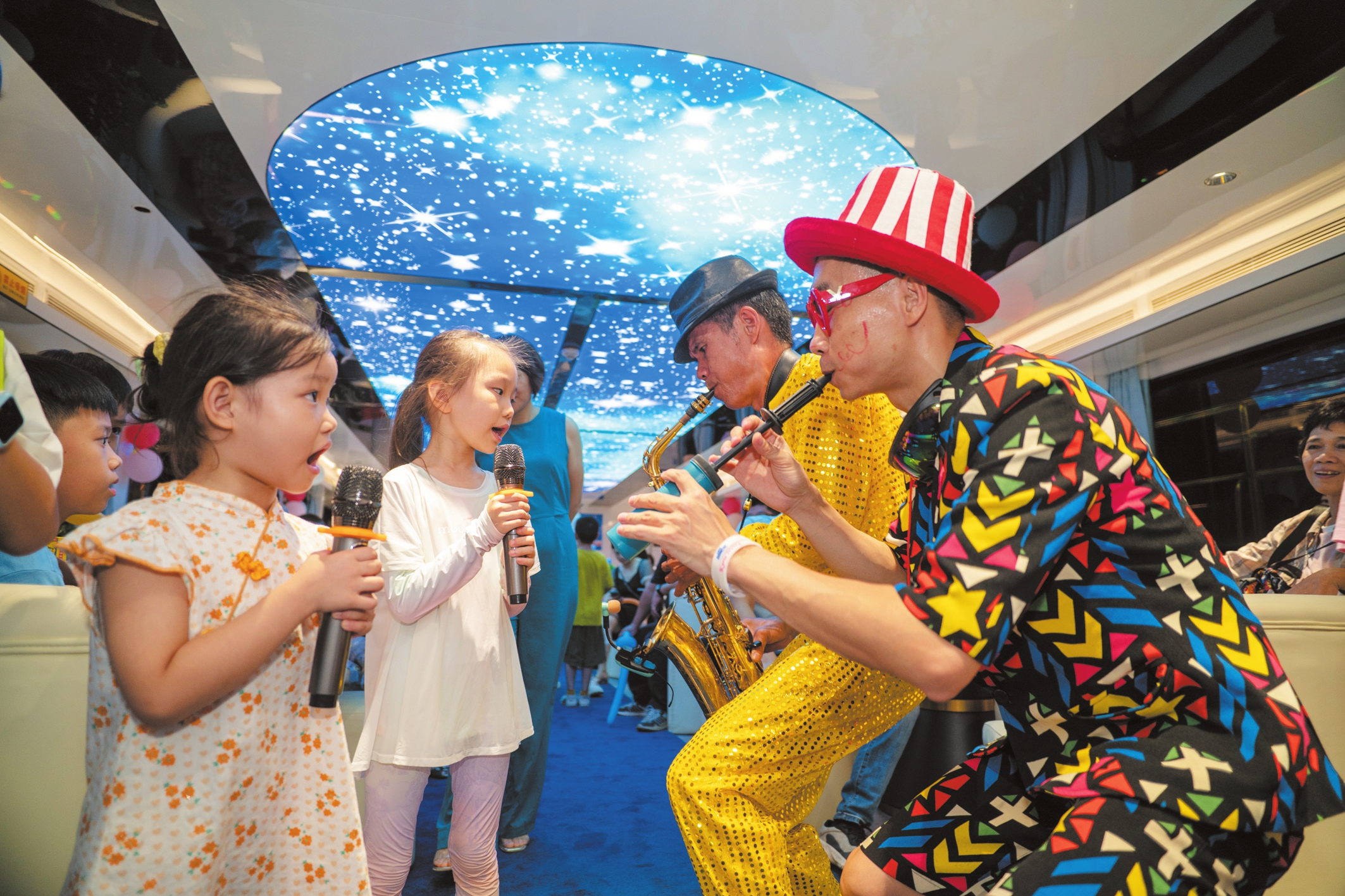 在海口“美兰1号”观光游船上,表演艺人与小朋友热情互动。本报记者 石中华 摄