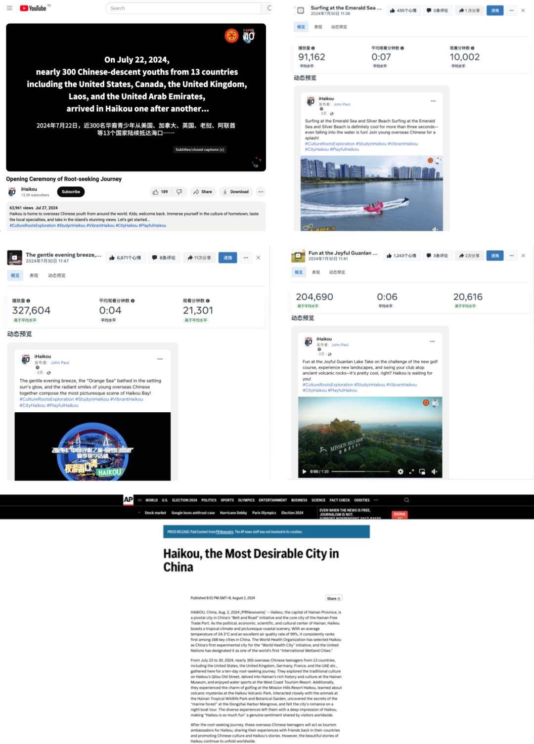 截止2024年7月31日,海口市旅游和文化广电体育局海外账号各平台共发布活动相关帖文65篇,其中Facebook 21篇,Twitter 13篇,Instagram 19篇,YouTube 12支;共获得曝光总量3,979,883次,其中Facebook 1,203,425次,Instagram 1,177,068次,X(原Twitter)527,753次,YouTube 1,071,637次;互动次数总量171,069次,其中Facebook 85,609次,Instagram 62,540次,X(原Twitter)22,920次;平台相关视频观看总量815,684次,其中YouTube平台视频观看量192,228次,Facebook视频帖文播放总量623,456次。海口寻根之旅相关信息稿件发布1次,被美联社、雅虎、BENZINGA、KTLA5、Morningstar、FOX福克斯等知名媒体在内的436家媒体转载。