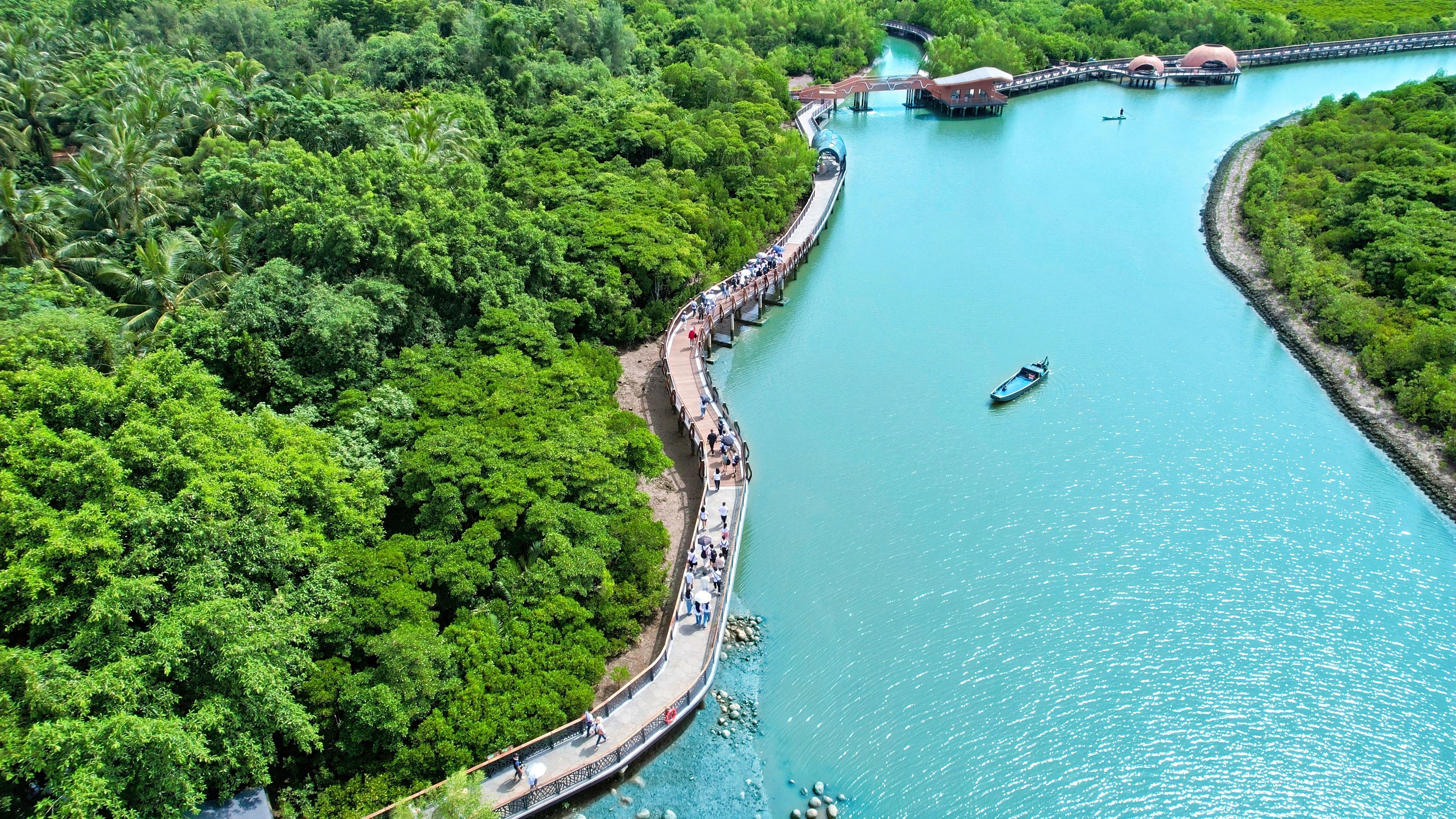 海口东寨港红树林是我国连片面积最大、树种最多、保育最好、生物多样性最丰富的红树林。在这里近距离可感受“海上森林”的壮阔景观。