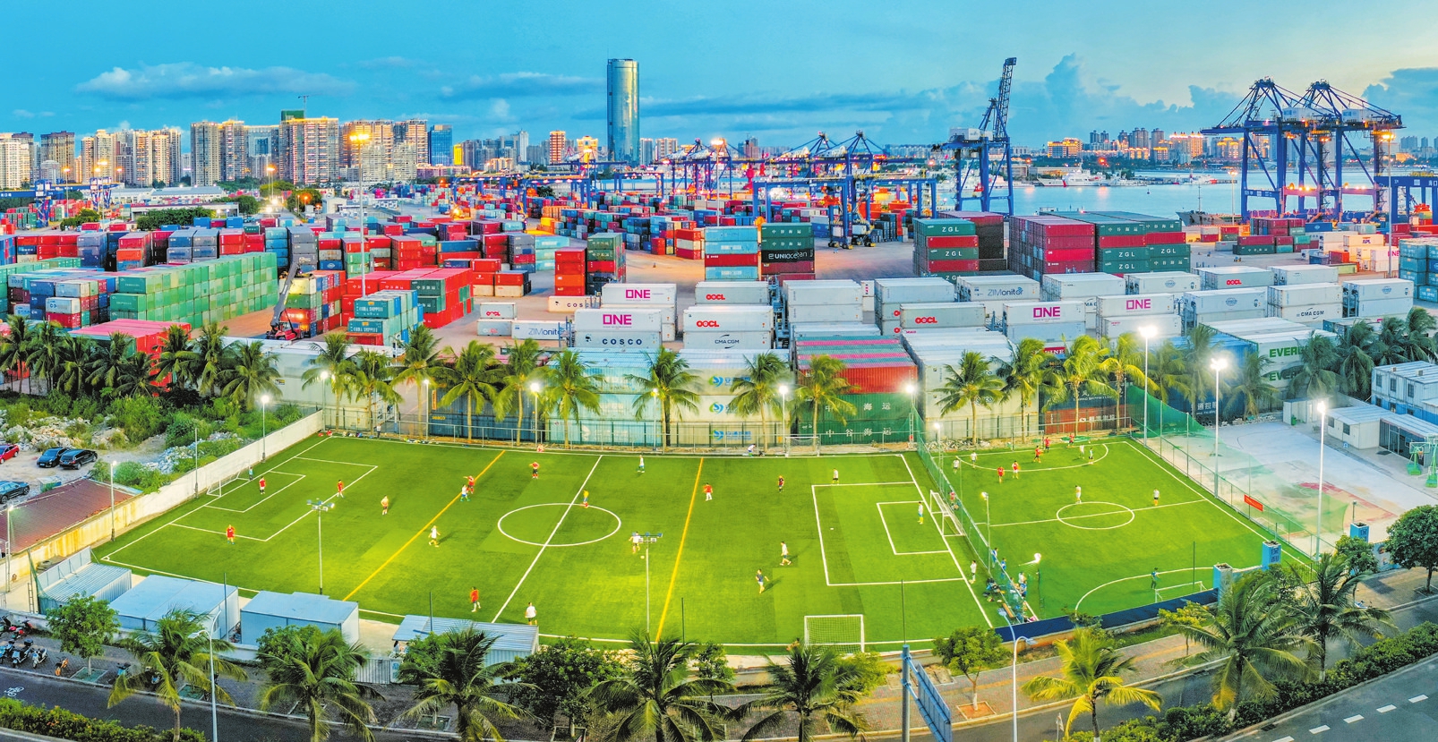 丽海二路附近的足球运动场,市民在享受酣畅淋漓的夜间体育运动。本报记者 孙士杰 摄