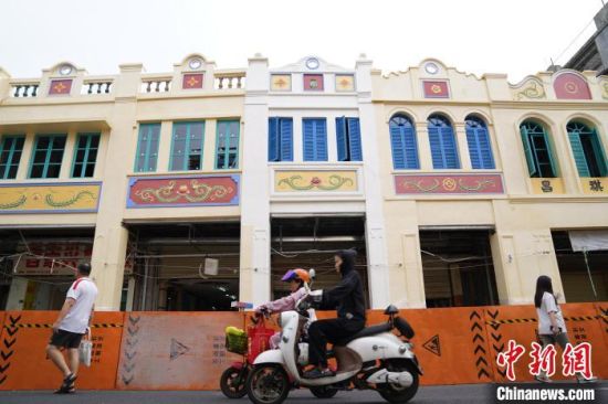 8月23日,海口骑楼历史文化街区博爱路保护修缮示范项目进入收尾阶段,骑楼外立面已完工。陈英清 摄