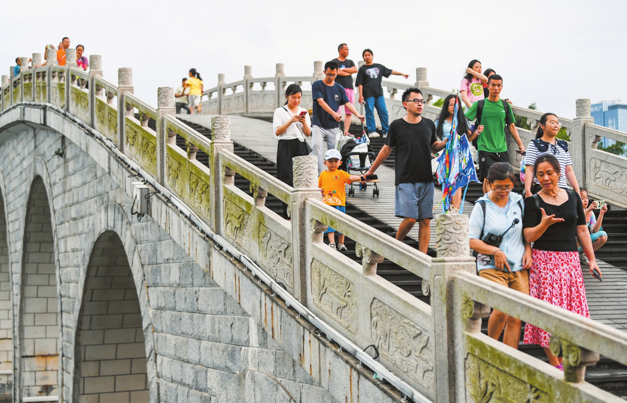 市民游客在海口万绿园拱桥上休闲赏景。本报记者 康登淋 摄