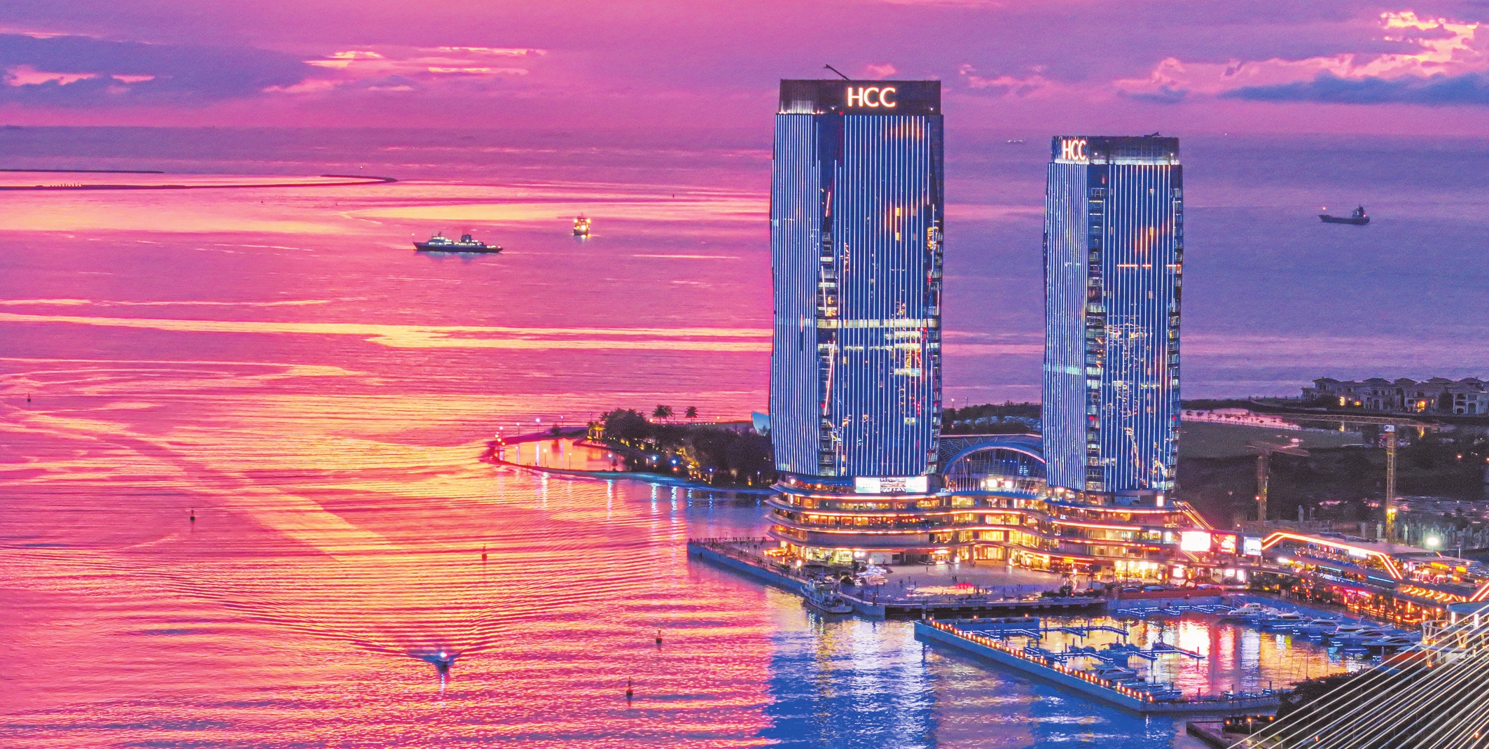 晚霞将海口湾染成紫金色,波光粼粼中散发着梦幻般的光彩,映衬着灯光璀璨的海口湾。 本报记者 康登淋 摄