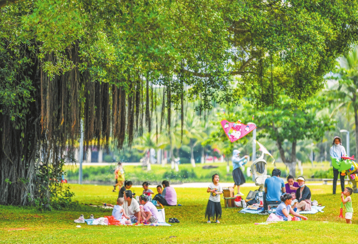 万绿园内满目青翠,市民游客在大榕树下休闲野餐,惬意十足。 本报记者 康登淋 摄