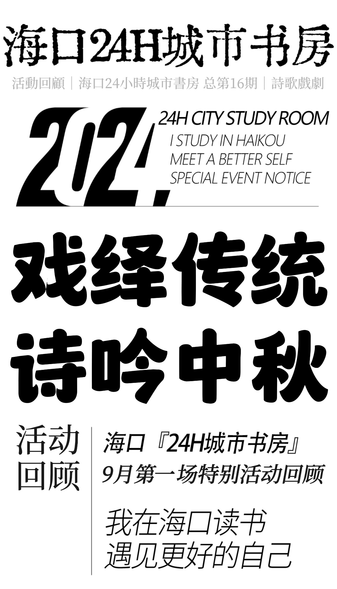 戏绎传统,诗吟中秋。由海口市旅游和文化广电体育局主办、海口市图书馆协办、海南木木研茶商业管理有限公司支持的——海口『24H城市书房』“我们的节日·中秋”特别活动之“戏剧诗歌工作坊”,自开放报名以来,受到了海口市民朋友的积极关注。
