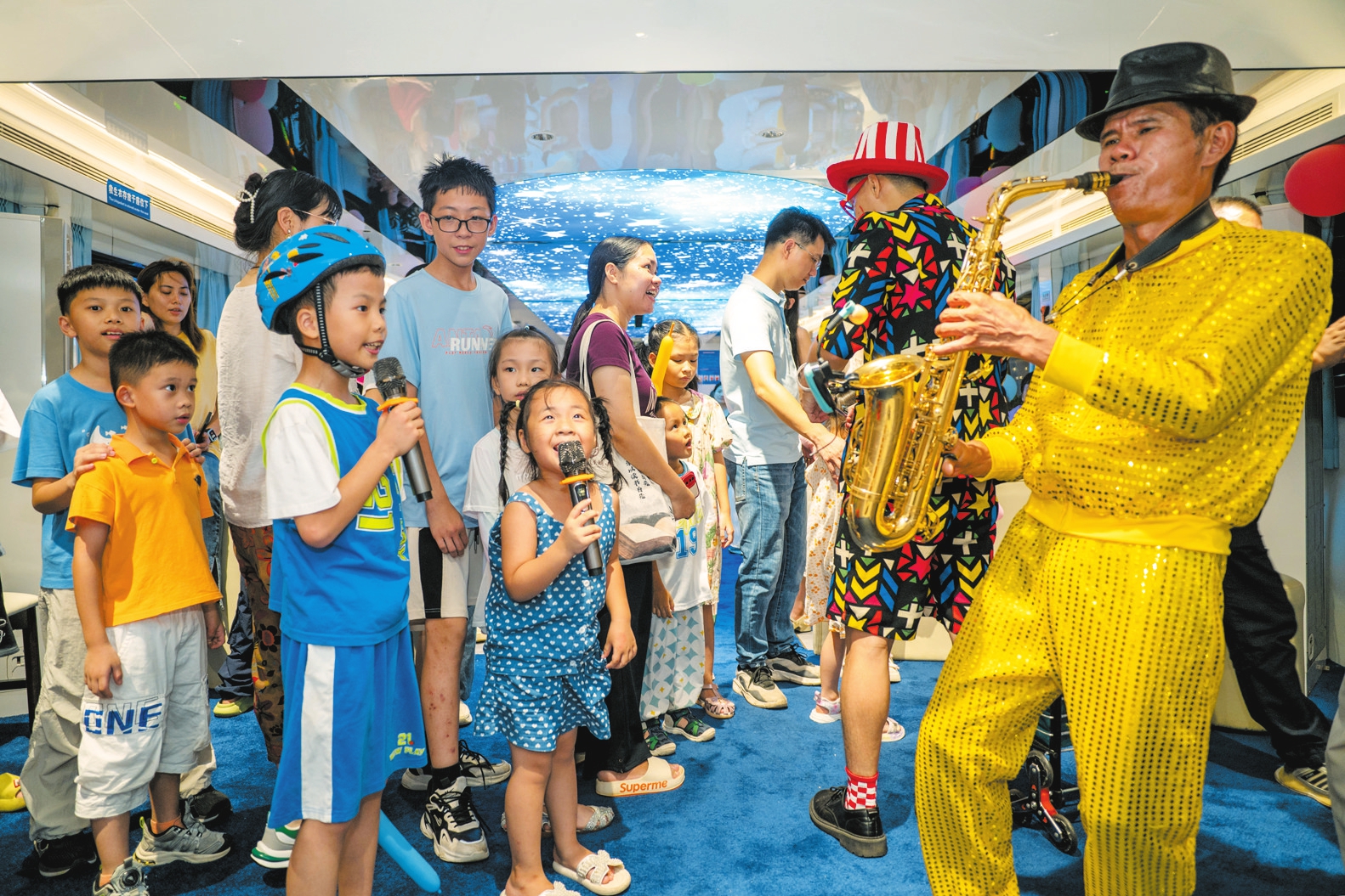 7月6日,海口市“美兰1号”观光游船上,亲子家庭载歌载舞。