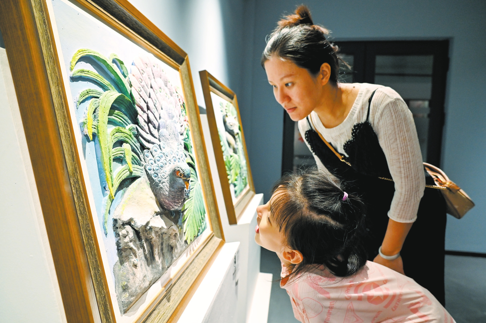 8月31日,游人在海口骑楼老街水巷口青相创意工坊内的翼果艺术空间观看海南热带雨林主题灰塑浮雕孔雀雉。
