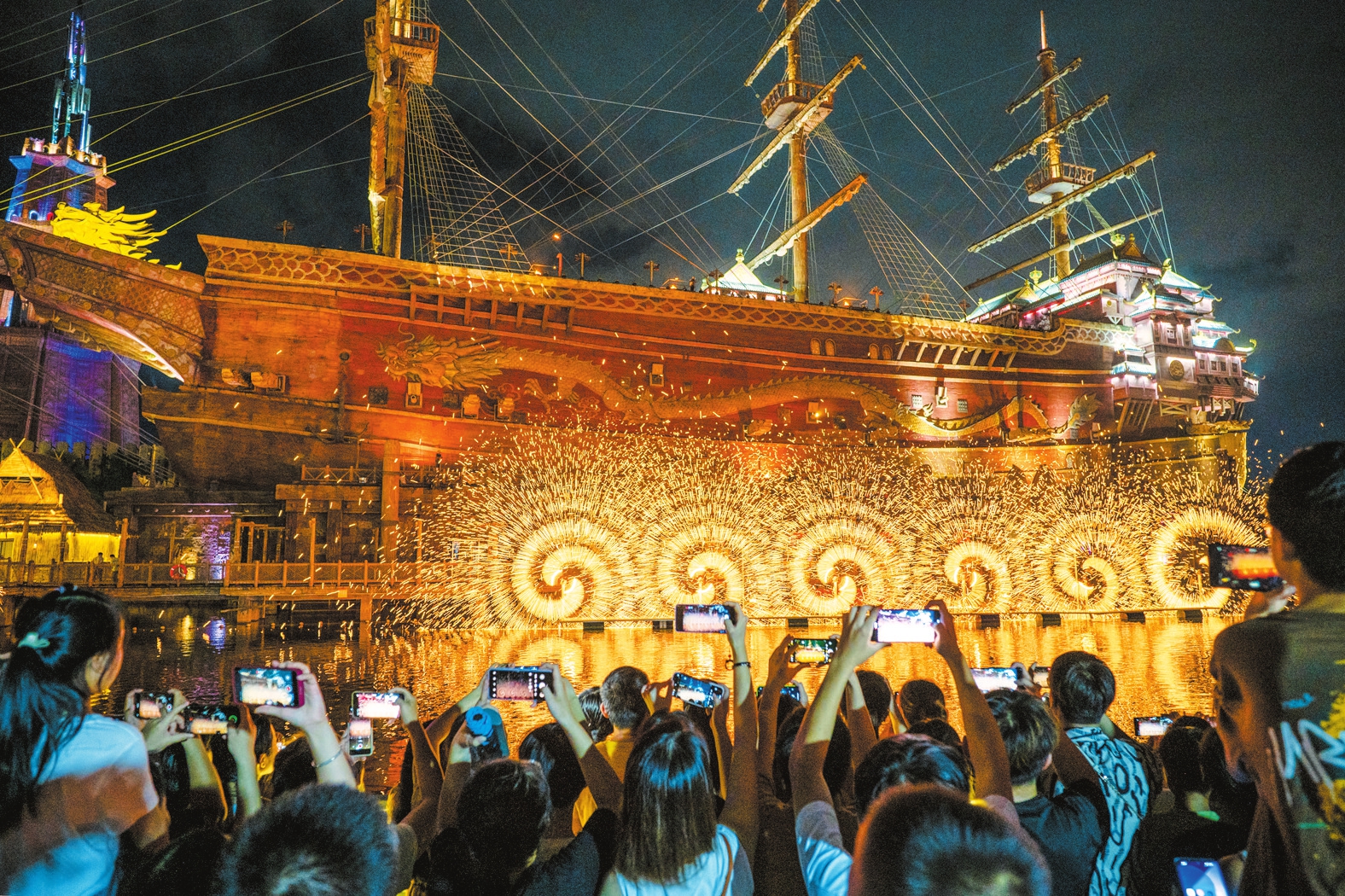8月10日,海口长影环球100奇幻乐园打铁花表演精彩纷呈。
