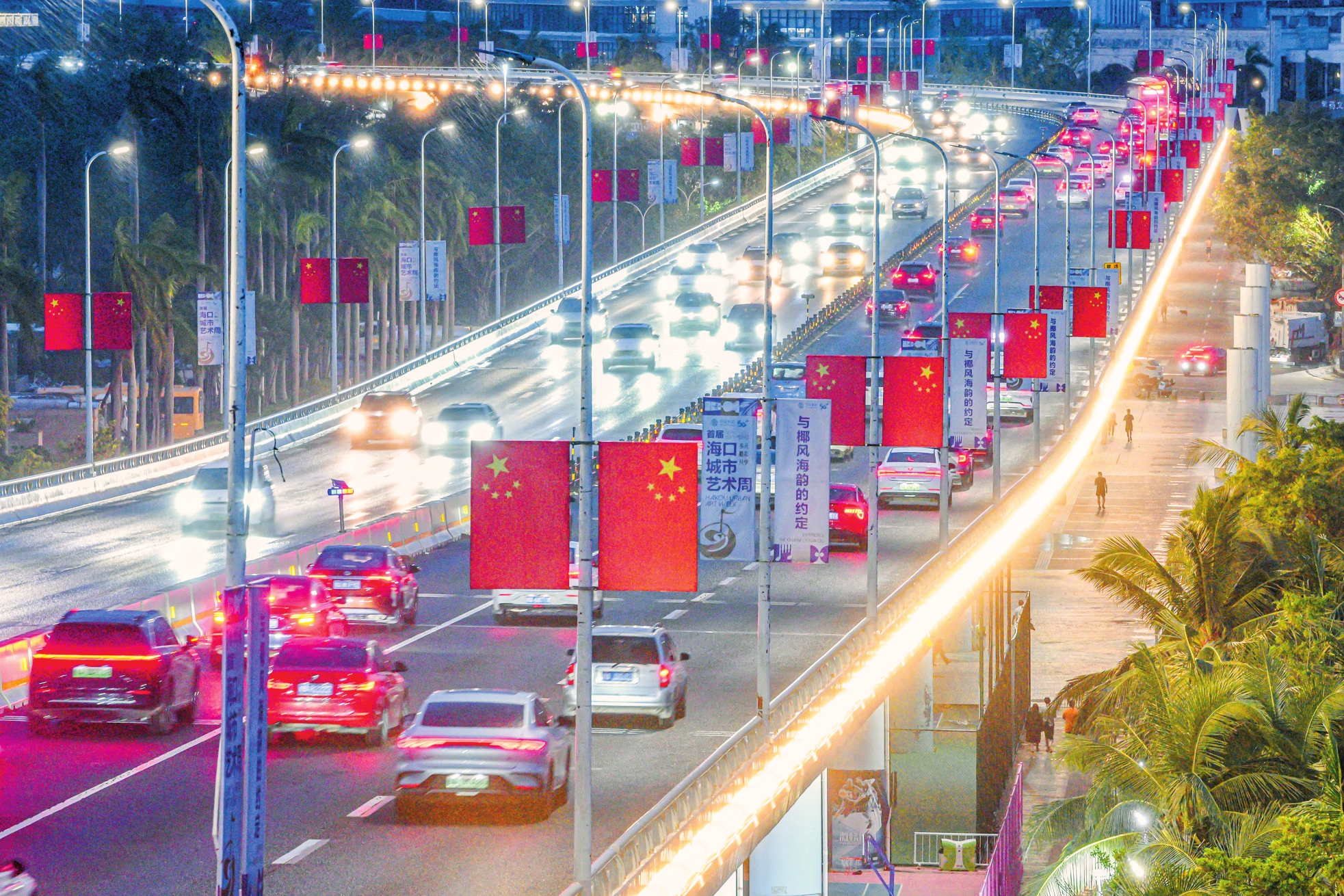 9月22日,海口世纪大桥上悬挂起国旗和带有海口城市艺术周LOGO及活动主题的道旗。本报记者 苏弼坤 摄