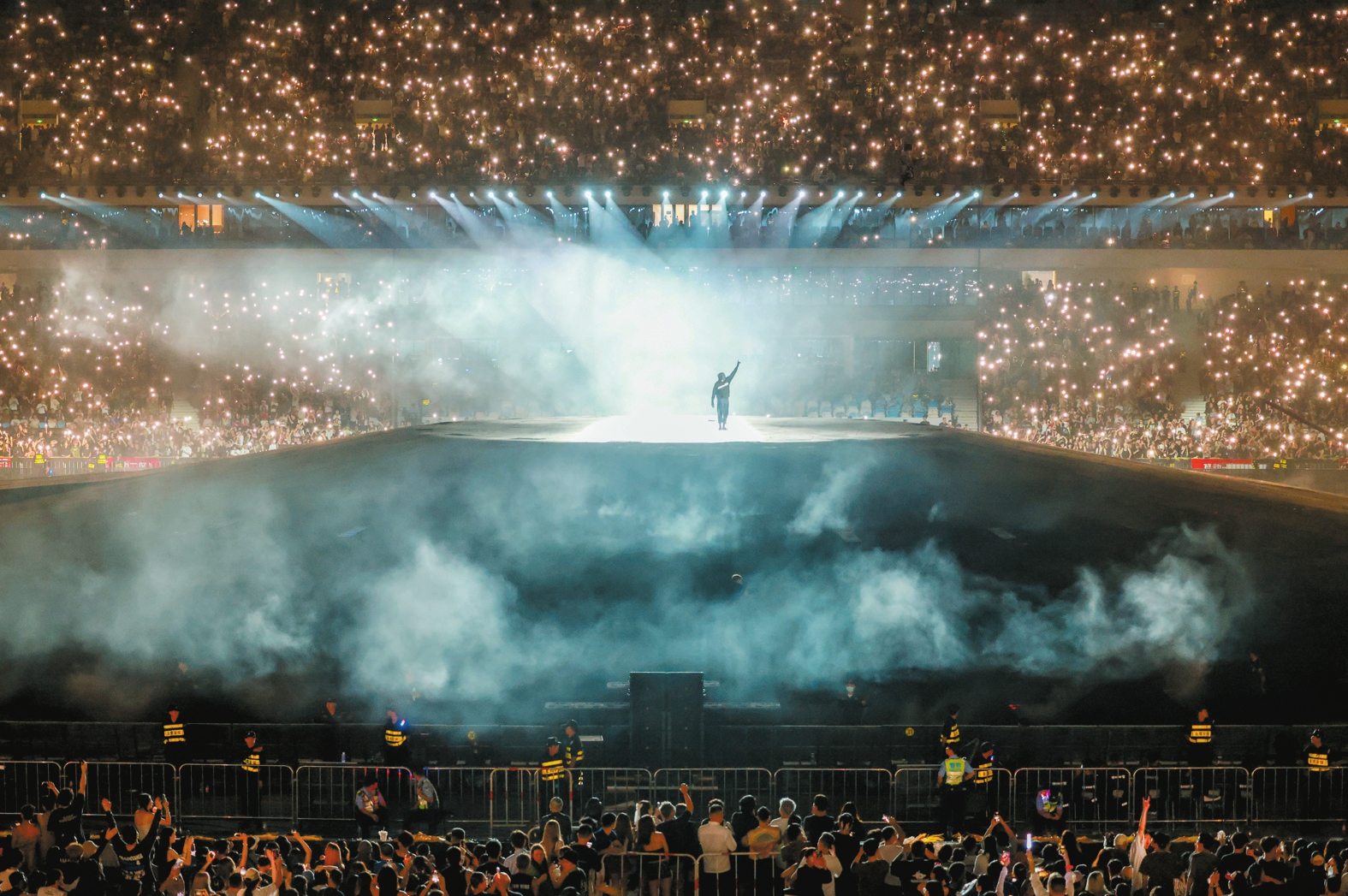 随着夜幕降临,五源河体育场内人声鼎沸,来自全国各地和海外的4万名歌迷齐聚一堂。大家自觉遵守场馆规定,有序入场、就座,并保持着良好的观演礼仪,共同期待着这场音乐盛宴开启。
