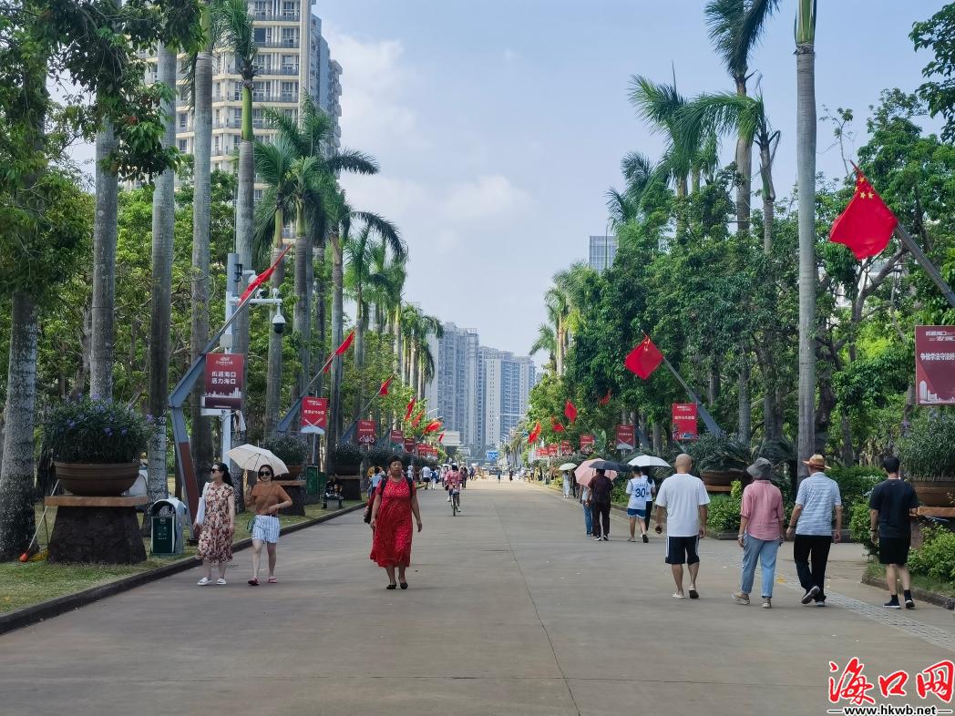 在海口万绿园,道路两旁红旗飘扬,鸟语花香,漫步其中凉风习习,很是惬意。虽然景区内游人众多,但路面上很少看到垃圾,每走100米都能看到垃圾桶。并且很少见到电动自行车“入画”穿行,游客们都选择将车辆停放在公园的规划停车场,在园区慢下来享受风景。