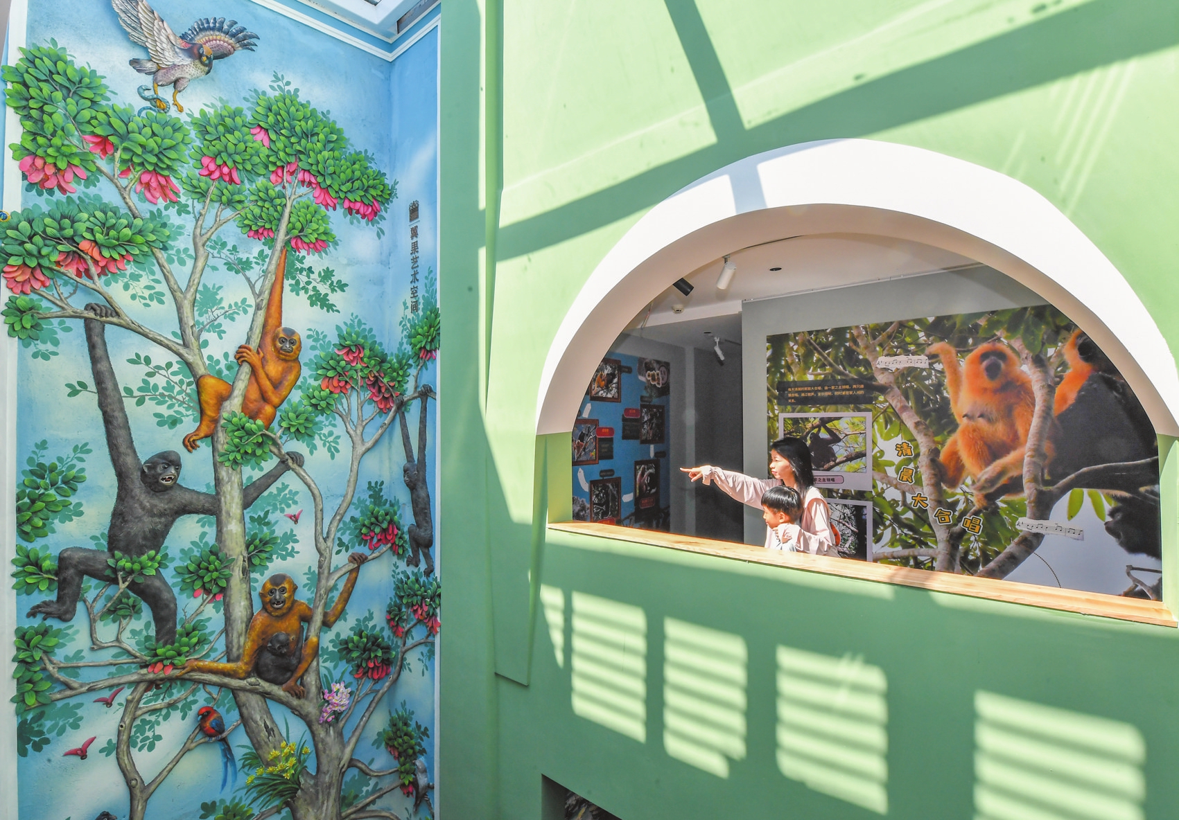 海南黑冠长臂猿展通过艺术呼吁人们关注生物多样性保护。被称为热带雨林的K歌之王,长臂猿有一个喉囔,鸣啼的时候,喉囔涨大,声音嘹亮,常常是雄唱雌和,一呼一应。每日清晨,海南长臂猿沐浴朝阳,吸纳清气,放声啼鸣。