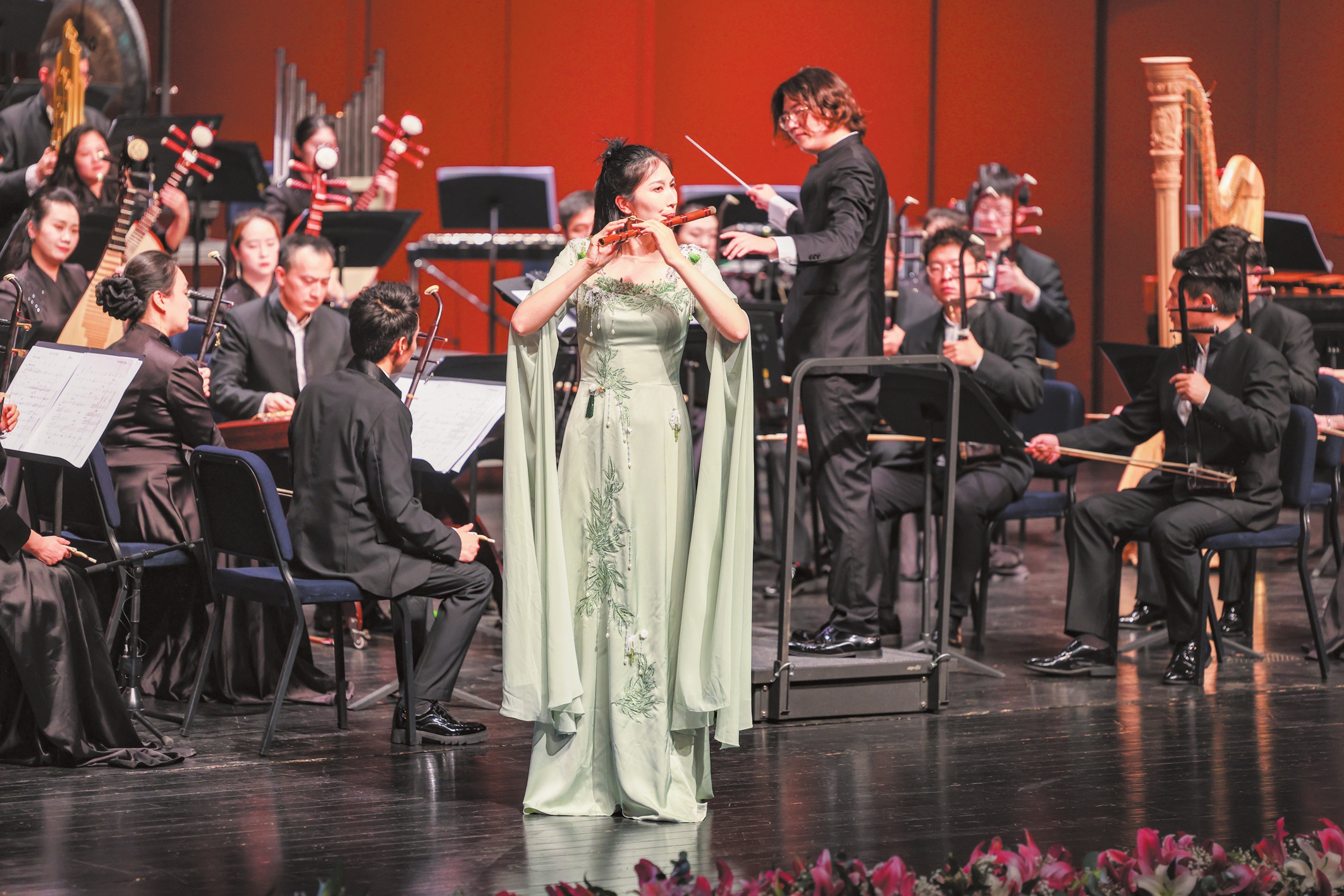 10月10日晚,中央民族乐团携《泱泱国风》音乐会,为首届海口城市艺术周画上圆满句号。图为笛子演奏。本报记者 苏弼坤 摄