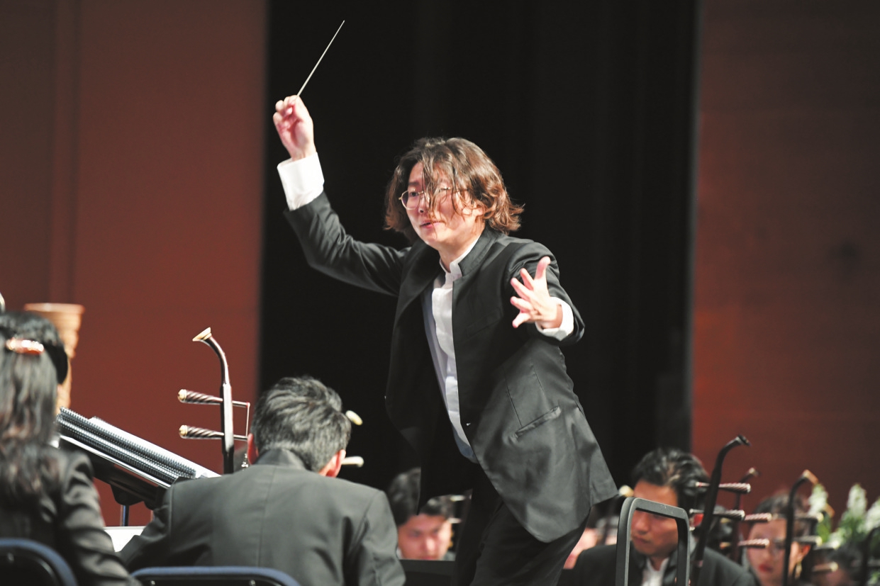 10月10日晚,在《泱泱国风》音乐会现场,指挥家带领观众一起加入到演奏中。 本报记者 苏弼坤 摄