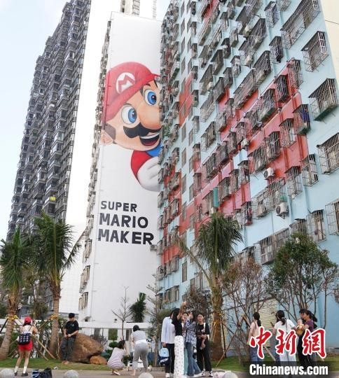 10月12日,海南海口,三五成群的市民在巨型“马里奥”动漫游戏墙绘前拍照打卡。陈英清 摄