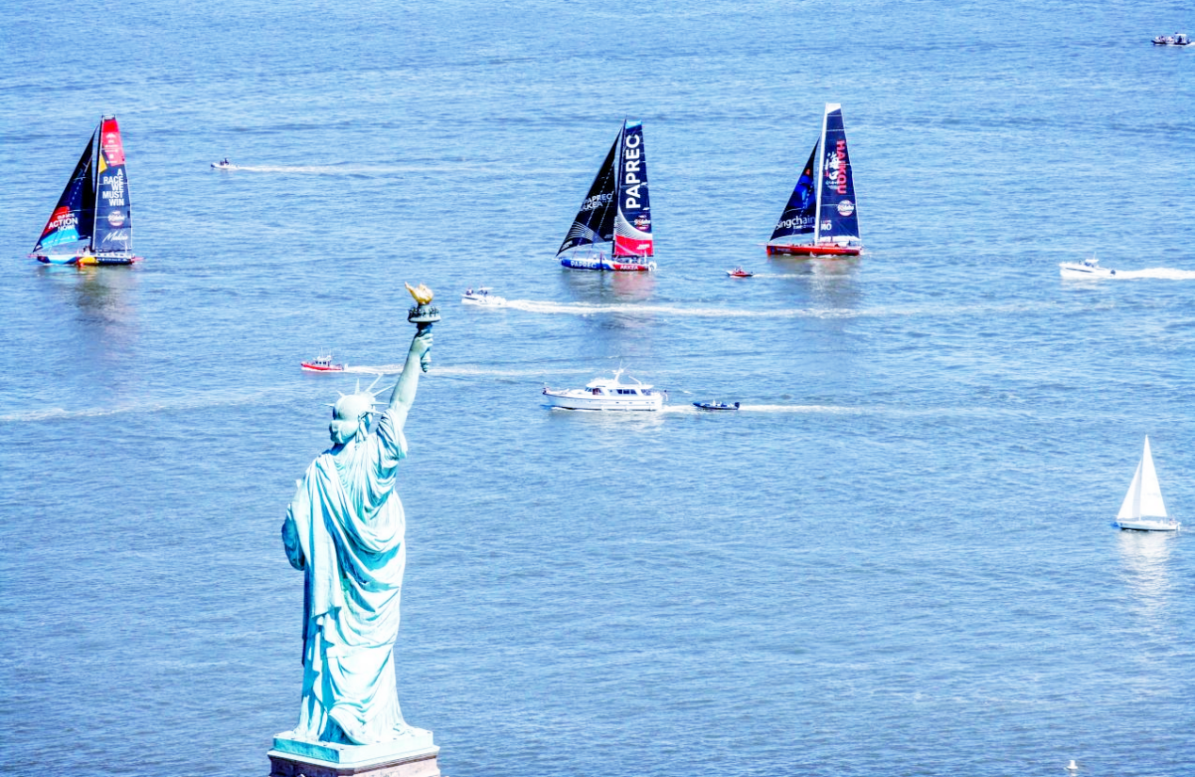纽约旺代单人不间断跨洋赛,“海口号”帆船扬帆哈德逊河 在自由女神像前升起五星红旗
