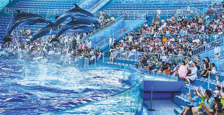 在儋州海花岛旅游度假区海洋乐园,游客近距离观看海豚表演。袁才 摄
