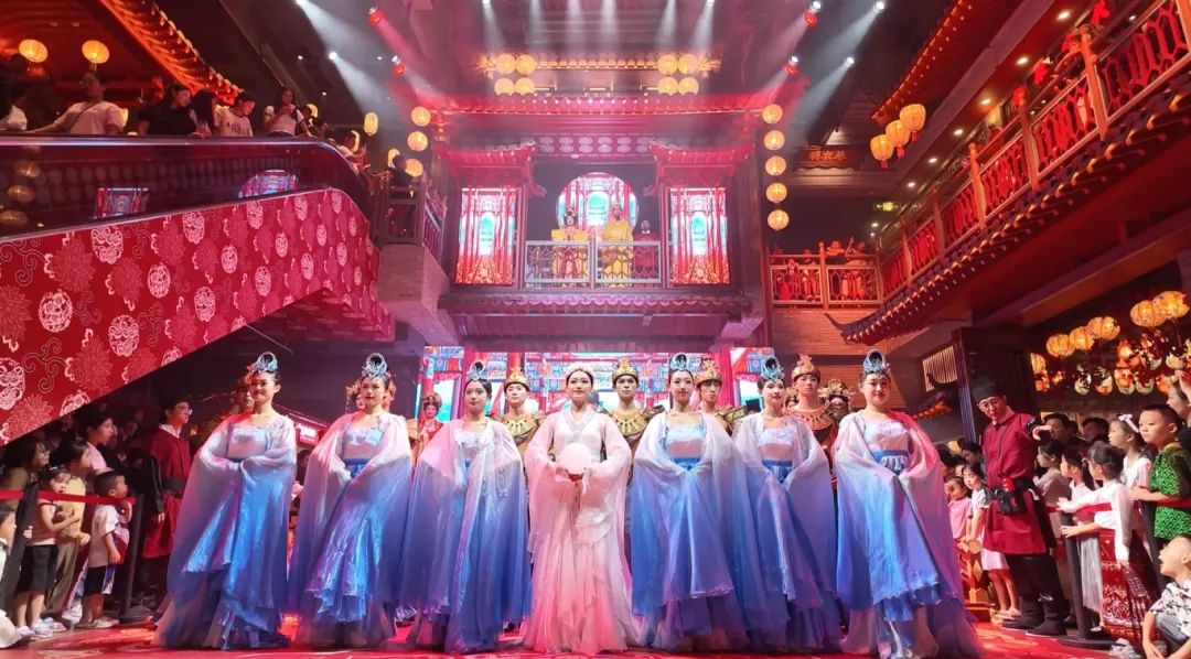 国潮城演艺是项目的一大特色,现场共有7个演出点位,多点位同时演出,演艺节目每天多至23场,以更路簿为背景,穿越千年时光长廊,做一场悠悠南海梦。