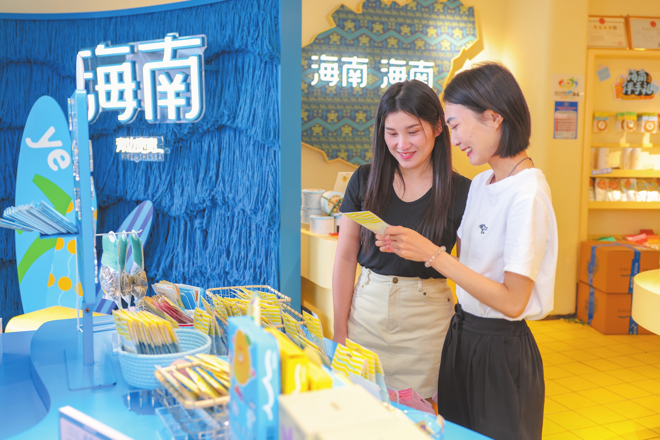 海边宽宽伴手礼骑楼店以海洋蓝色为主色调,摆放着各种包装精美时尚的伴手礼产品。10月27日,江西游客张女士第二次来购买巧克力、椰子糖等产品。“昨天买了巧克力觉得很好吃,准备多买些回去送给朋友。”张女士表示,独特的口味加上时尚包装,是她回购的原因。