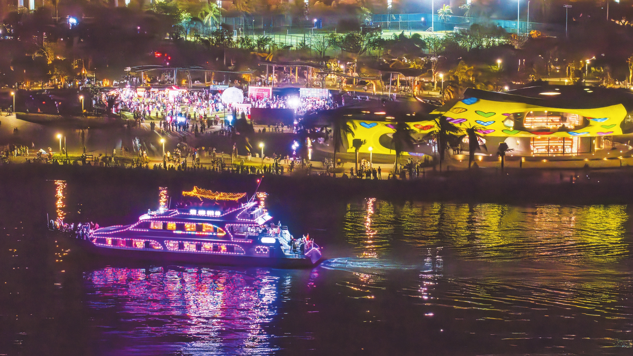 夜幕降临,华灯初上,“美兰1号”游船从渔港印象游船码头缓缓起航,作为新生的“水上明珠”,点亮城市的夜。