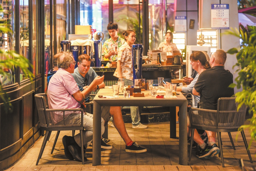 10月27日,在华彩海口湾广场,市民游客在夜色下享用美食。本报记者 杨鹤 摄